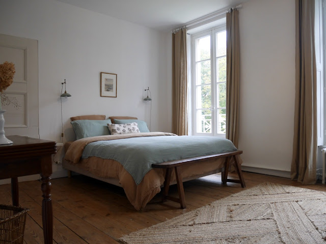 Si l’on monte quelques marches une deuxième chambre, cette fois-ci avec vue sur le parc, se laisse apercevoir. Les tomettes d’époque, la cheminée et le miroir ancien confèrent une ode au passé, revisitée par un linge de lit frais et délicat.