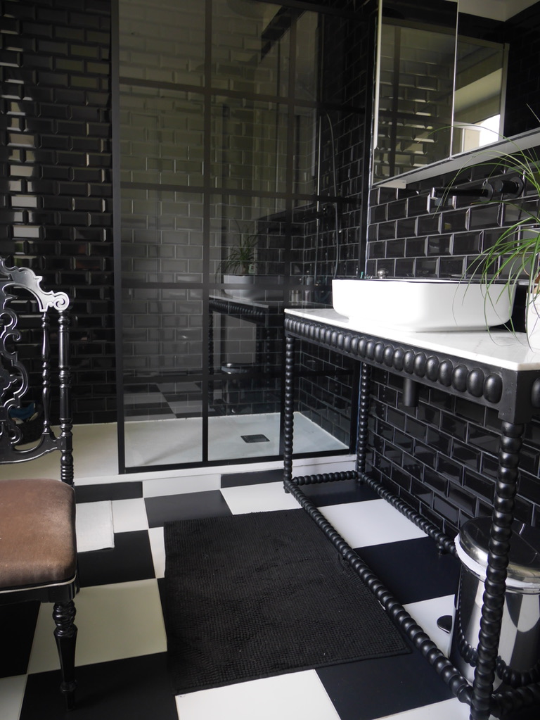La salle de bain s’inscrit dans la même vibration : élégance, cachet et fantaisie ; une sorte de version spirituelle et sacrée de celle d’Andrée Putman, agrémenté d’un prie-dieu en guise de valet de chambre.