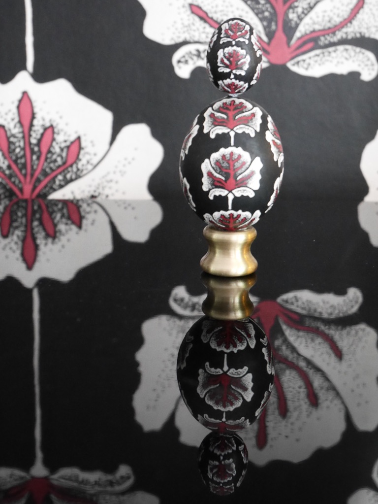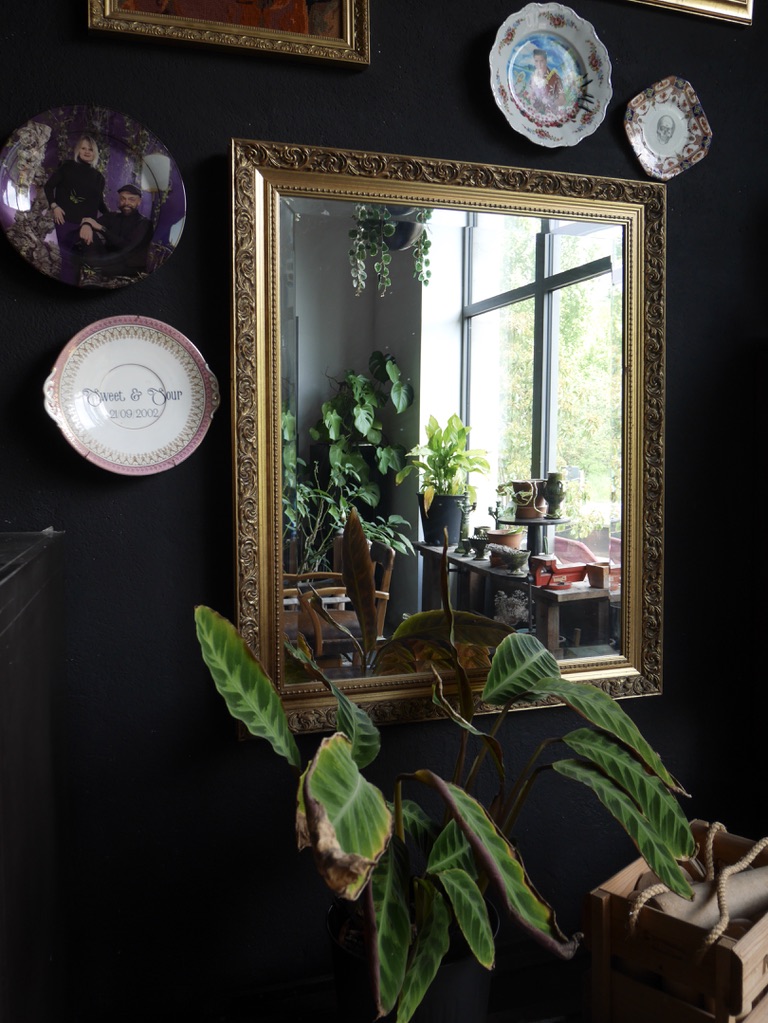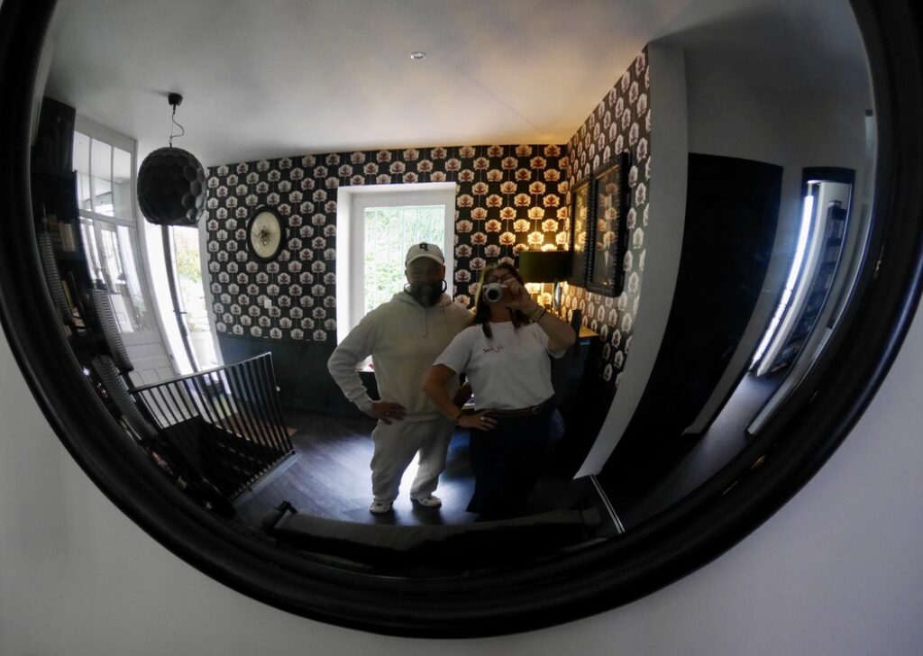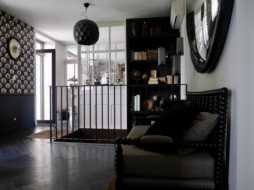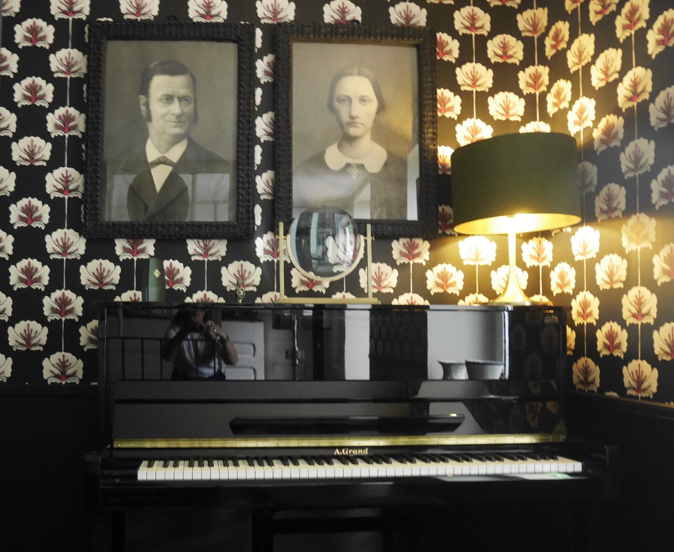 Sur le palier, prolongement de l’escalier, un piano. Un miroir de sorcières XXL. Des portraits de famille. Un papier peint. LE papier peint qui s’affranchit de tous les codes et qui donne à la petite pièce un style incomparable. Savoir que son motif est la réplique d’une version miniature réalisée sur un œuf par l’une de leur fille, véritable artiste, n’en est que plus émouvant et unique.