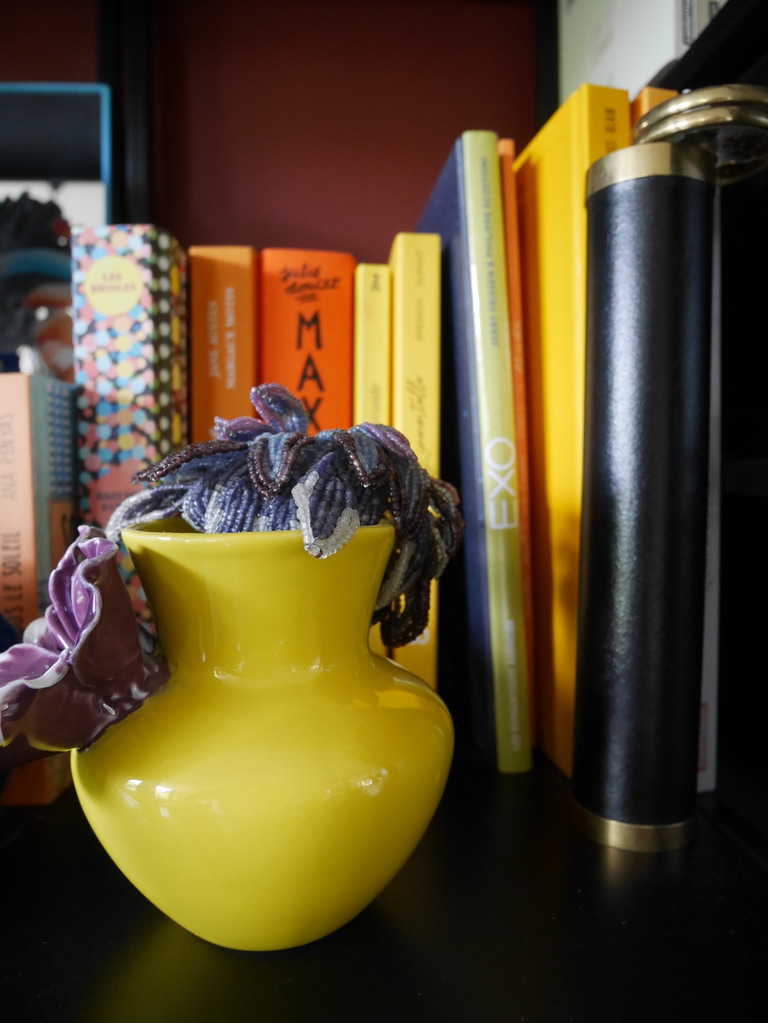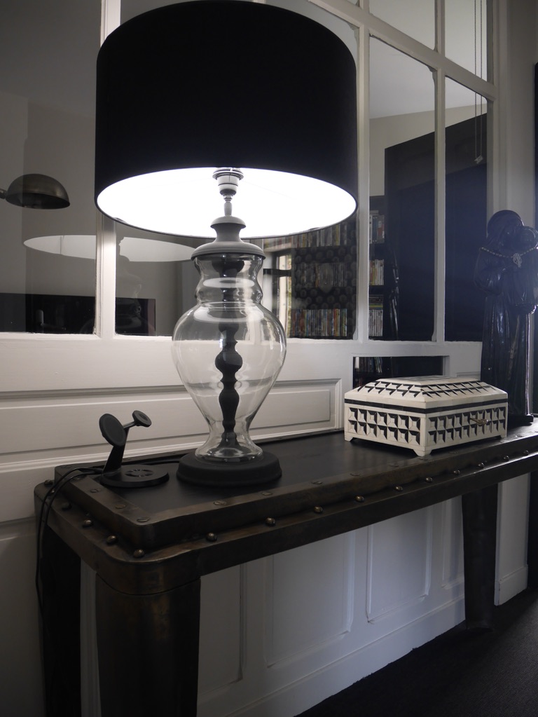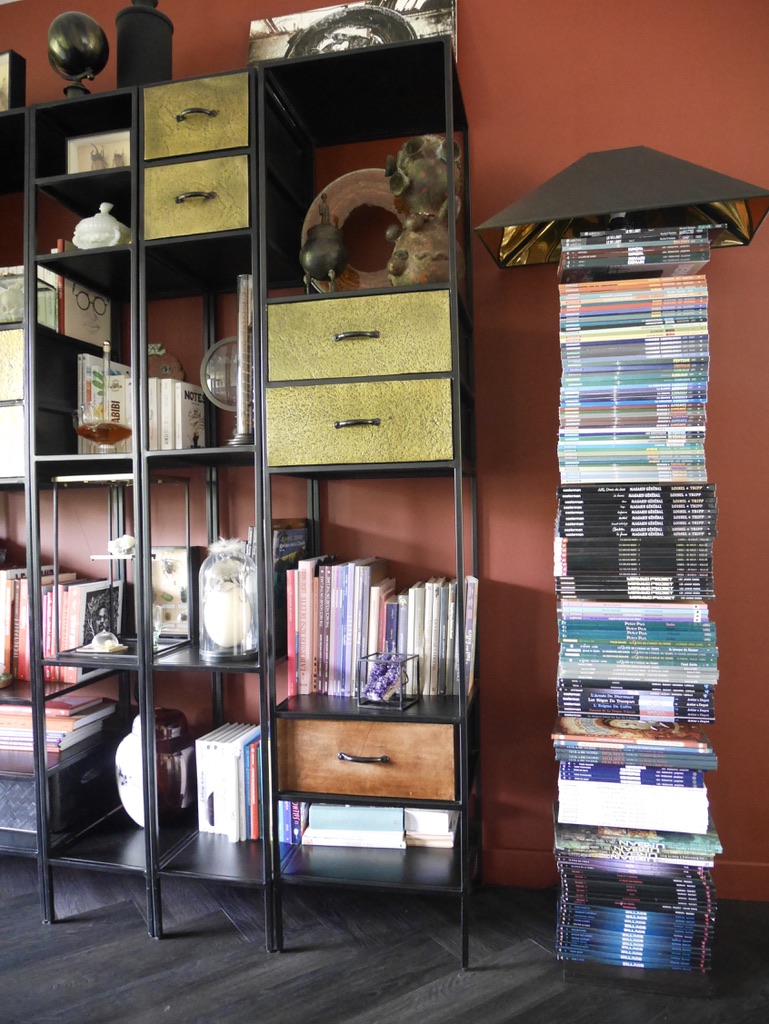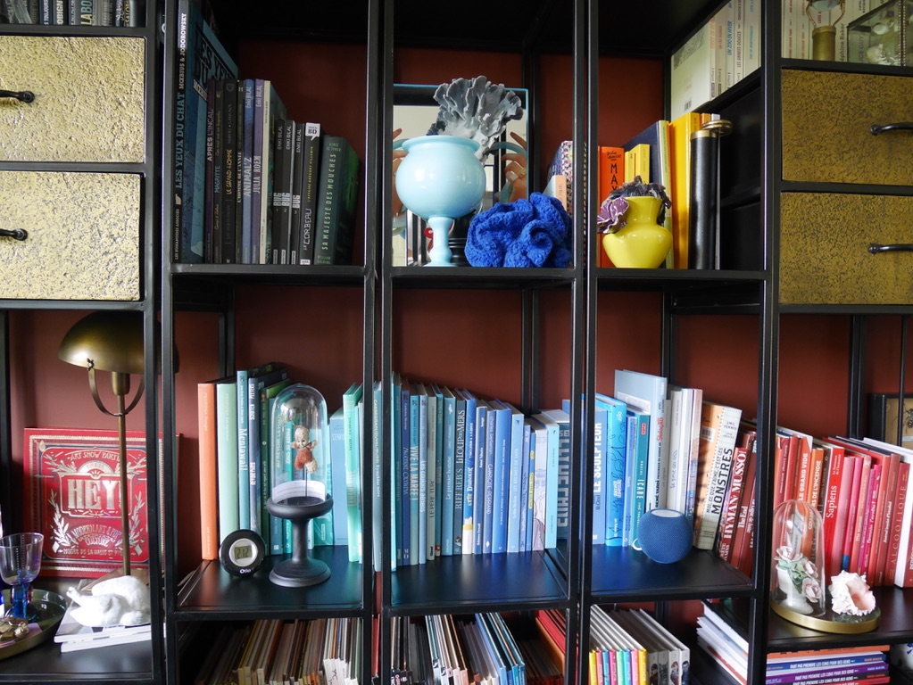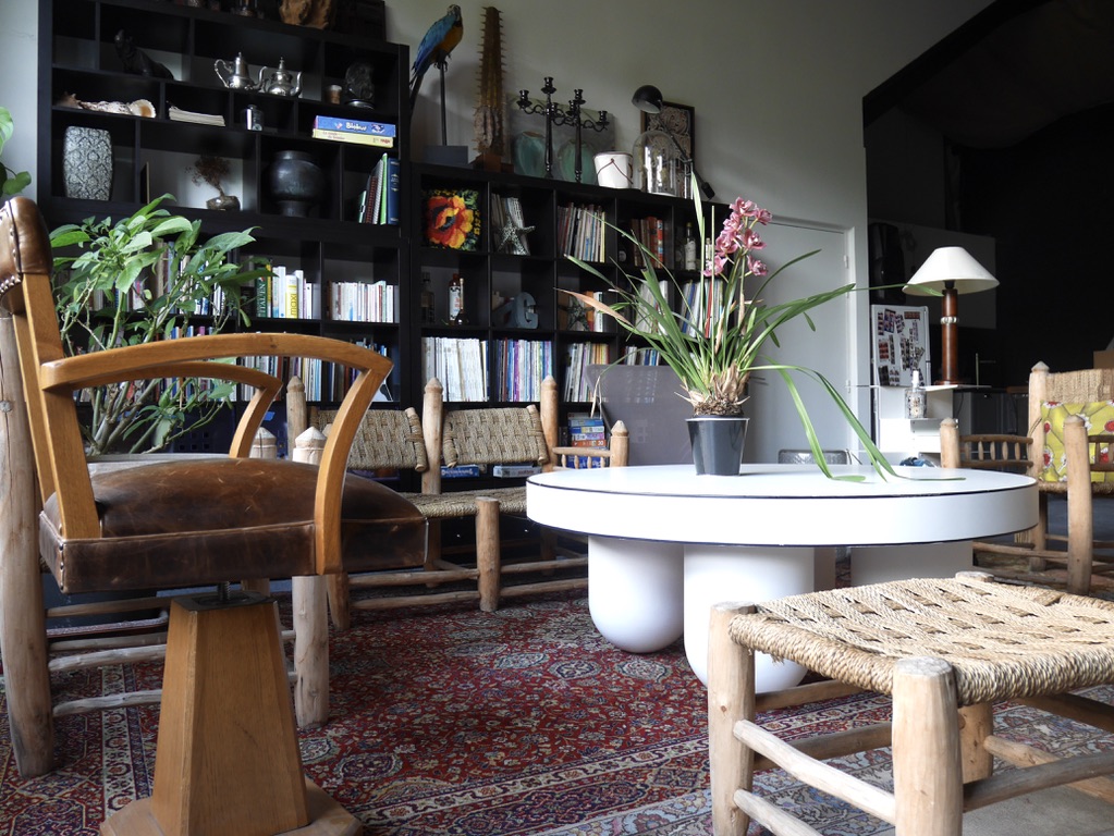 Tout y est pour me ravir et je sais que je suis en train de prendre une vraie leçon de style : les verrières des anciens ateliers de l’usine, les parquets, la bibliothèque dont les tranches des livres sont rangés par camaïeux de couleurs, les fauteuils vintage, le plinth de gymnastique en guise de table basse, le mobilier design en général. Et surtout, surtout, les objets. Pas n’importe quels objets. Ceux de leurs créations, tout droit sortis de leur imagination féconde.