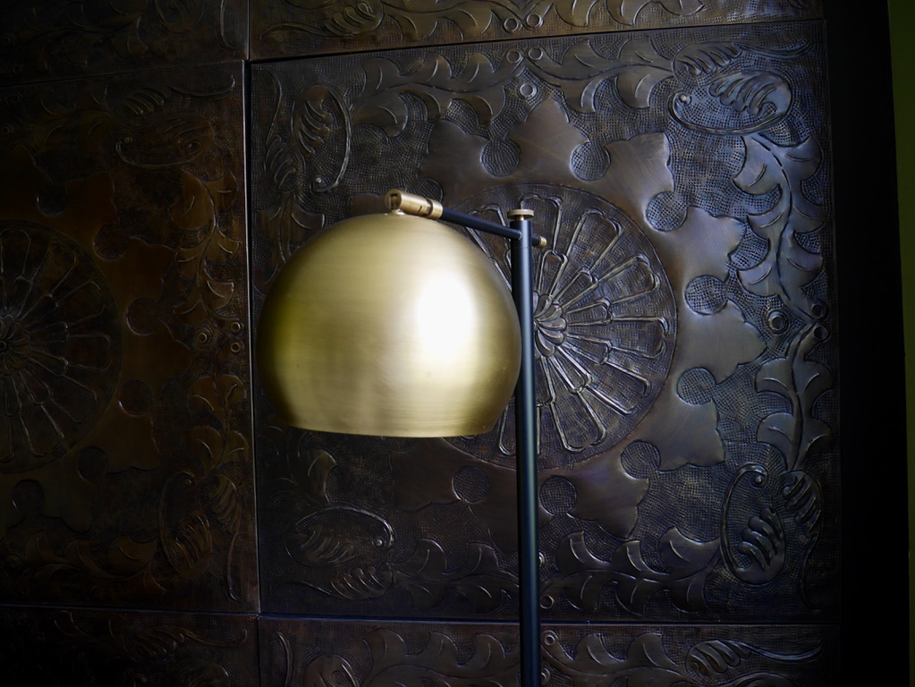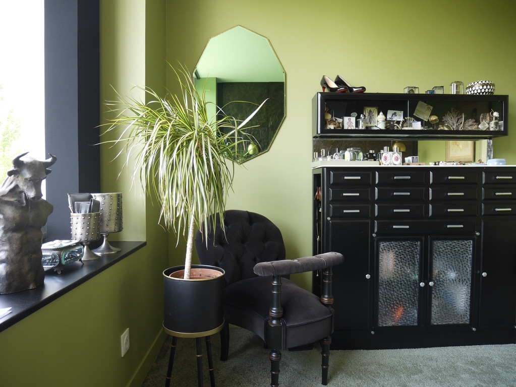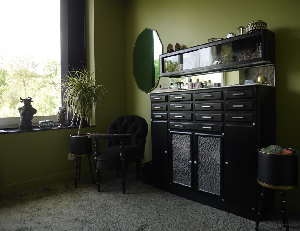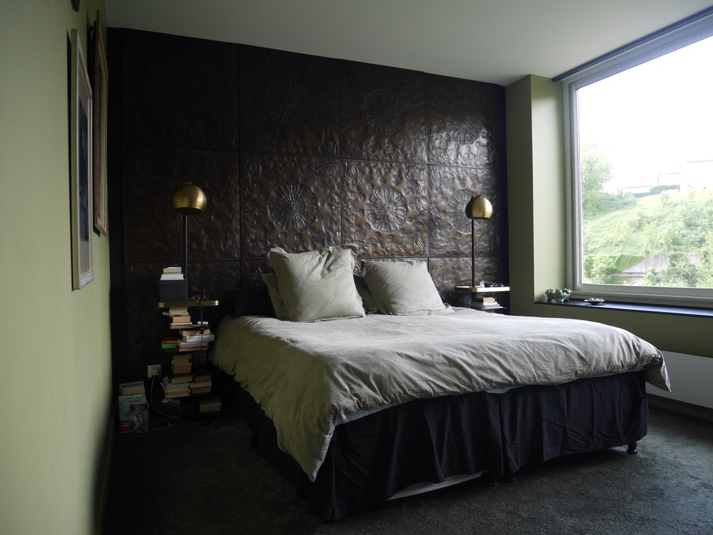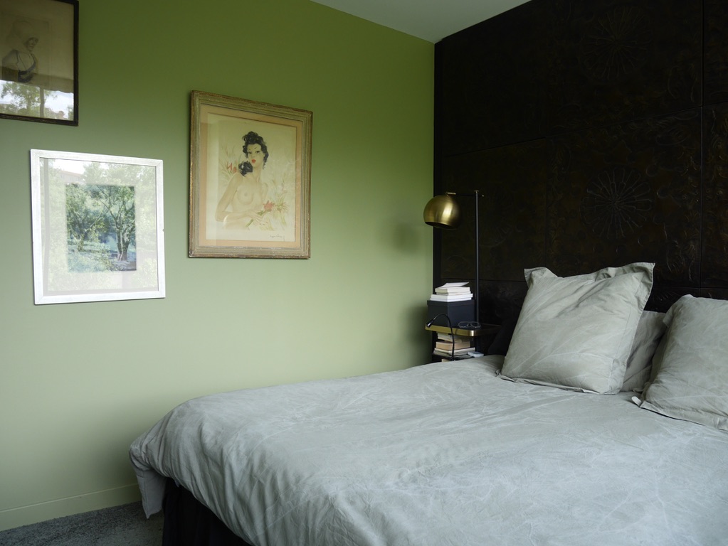 Dans la chambre, en guise de tête de lit, Lilau et Pierre ont imaginé un assemblage de plaques en métal gravé en relief issues de leurs propres collections « Objet de Curiosité » qui se suffisent à elles-mêmes et donnent un cachet à l’ensemble. Elles sont adoucies par le vert tendre des autres murs qui se confond avec la végétation extérieure et une moquette généreuse sur laquelle on a juste envie de se lover.