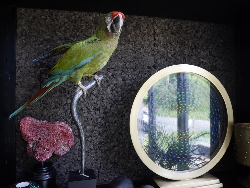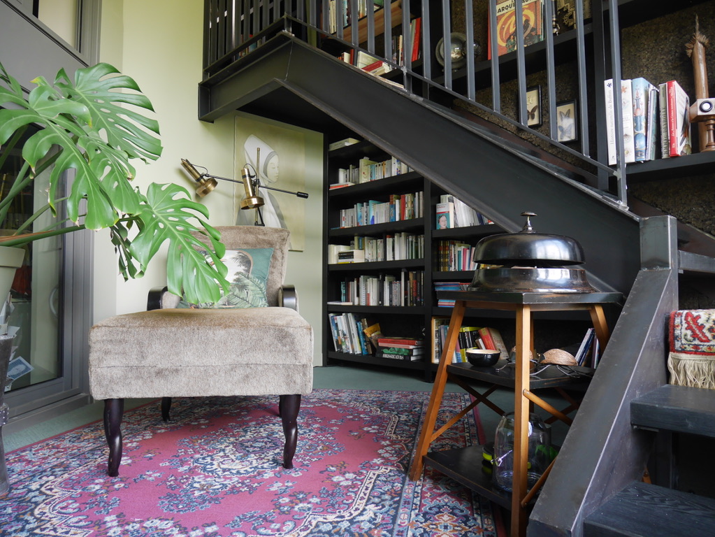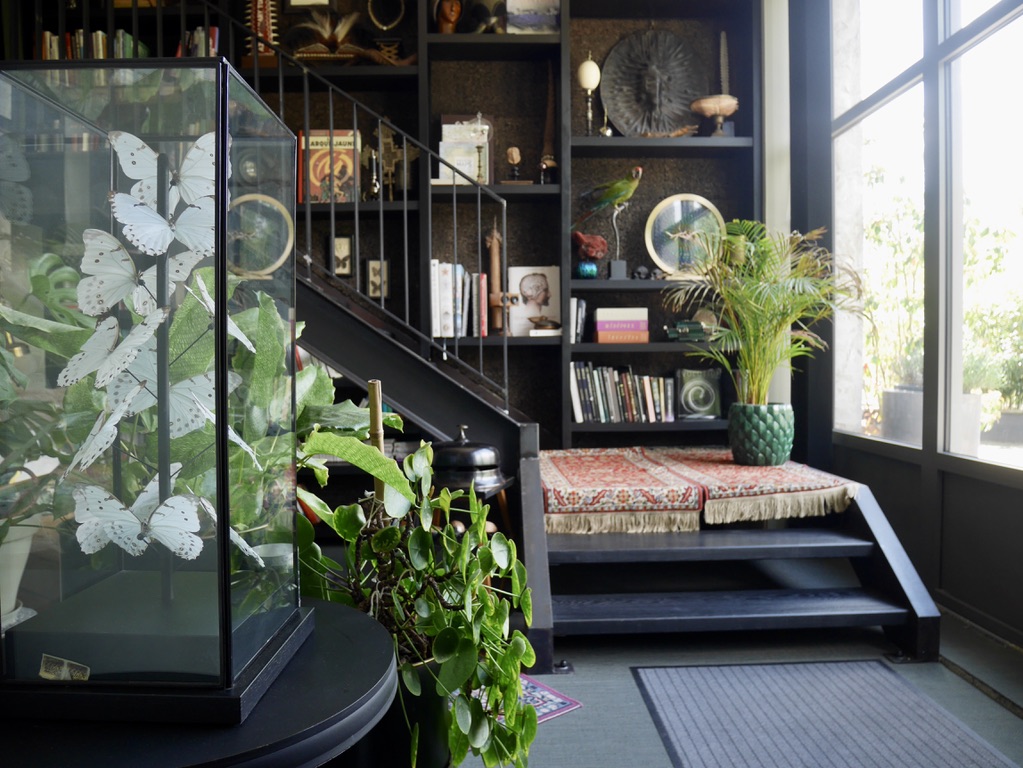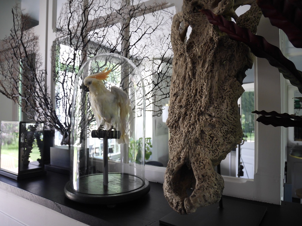 Avant de me hisser au septième ciel, je me suis d’abord aventurée au rez-de-chaussée réservé aux amis. Après quelques chambres dédiées, je me suis retrouvée dans une immense pièce à vivre quelque peu insolite, mélange de jardin d’hiver, de family room et de cabinet de curiosités.