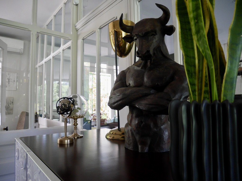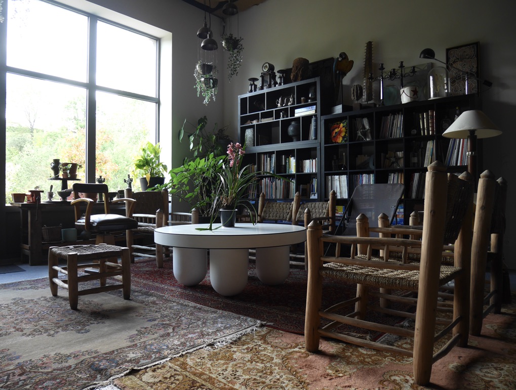 Mélange des styles assumé, effet des plus garantis. Je ne sais plus où je suis et je perds mes repères… Dans un riad ? Une orangerie ? Un musée ? En tout cas un lieu de vie, assurément. Lilau me confie qu’avec Pierre, ils avaient même eu l’idée d’y déposer une caravane pour y ajouter une chambre pour les enfants ou les copains de passage.