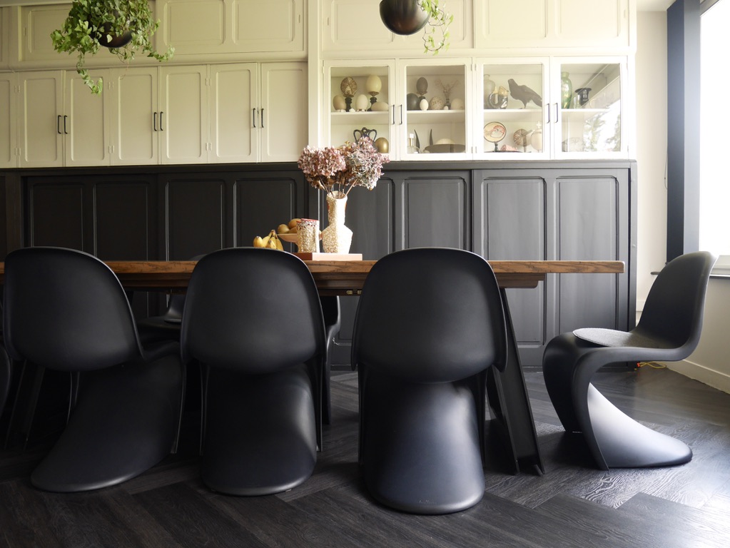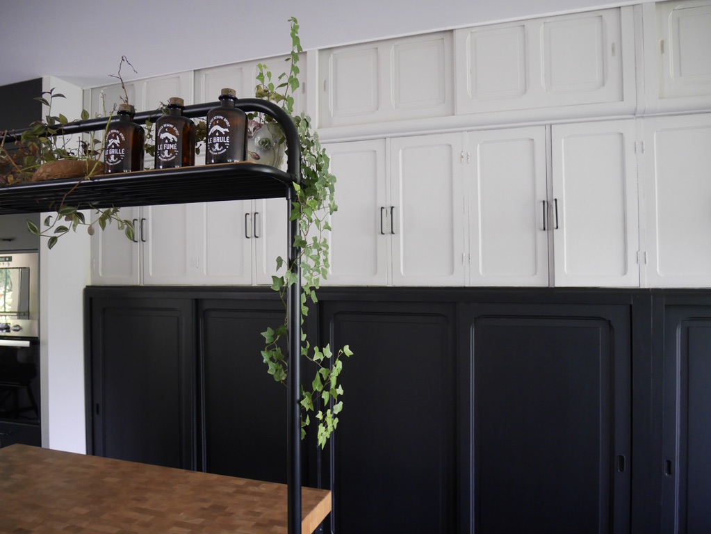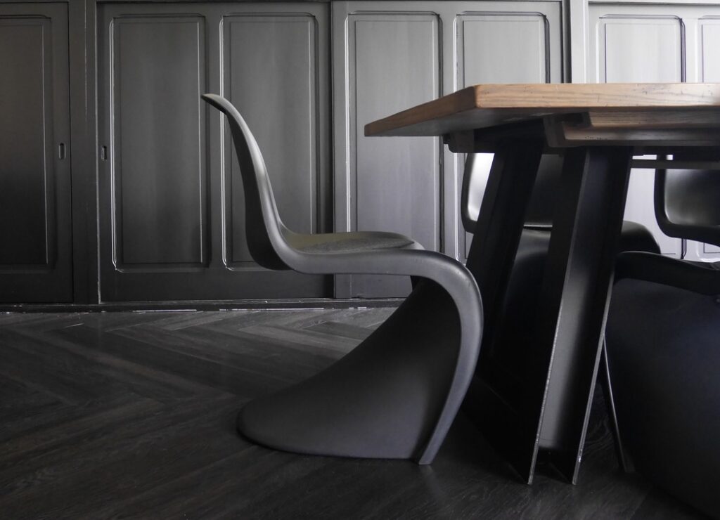 La cuisine-salle à manger logée dans les anciens bureaux contraste par sa dualité graphique et la sobriété de ses tons.