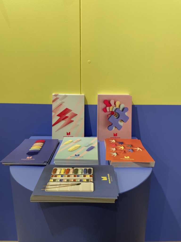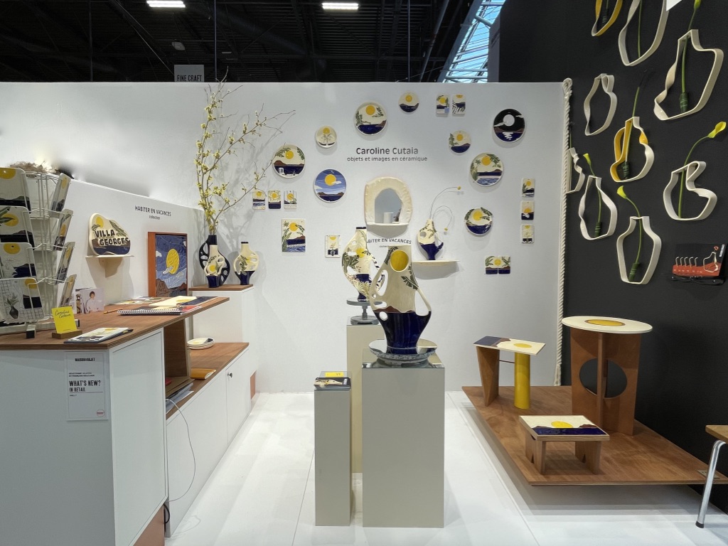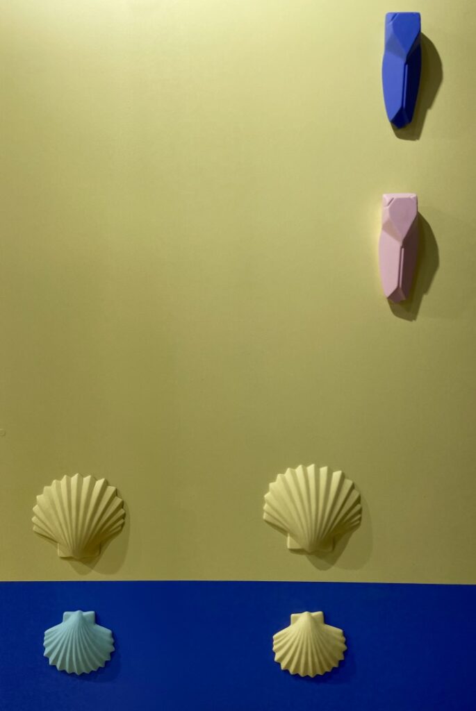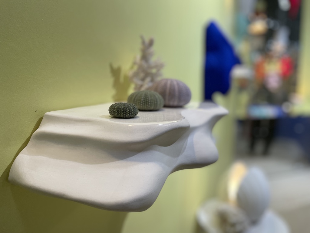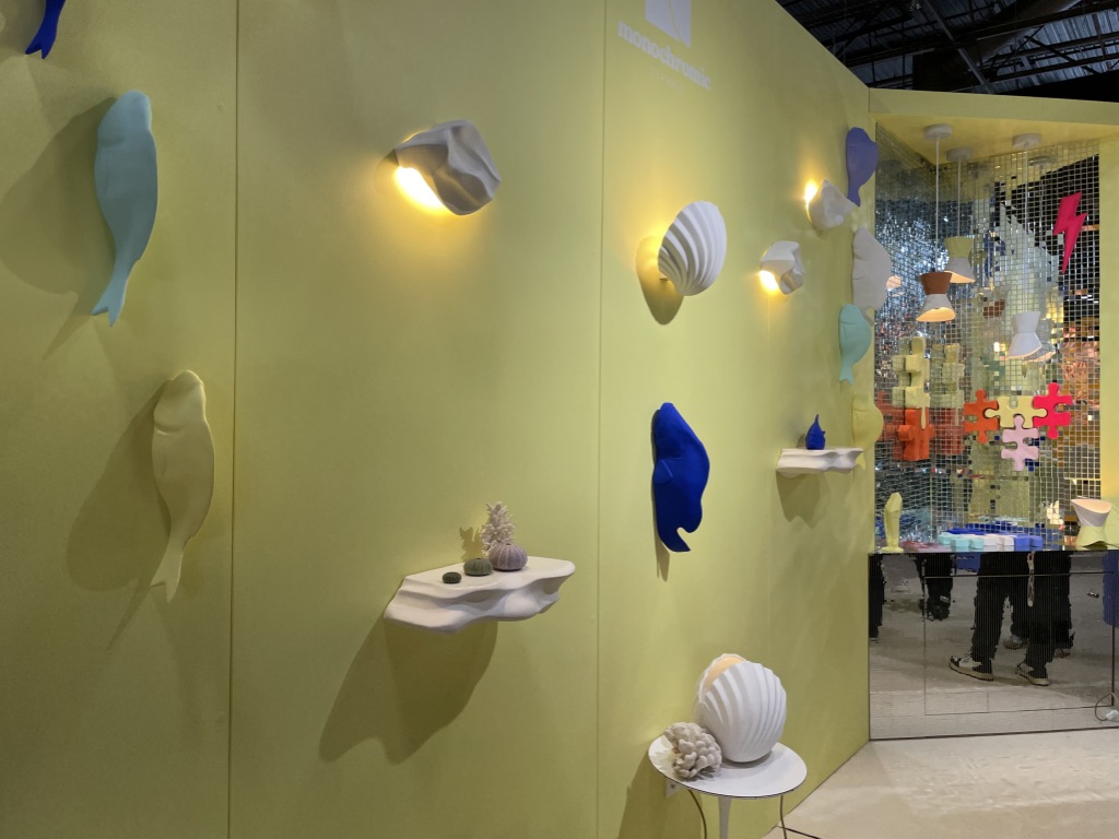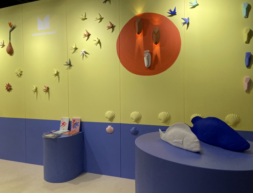 Si vous me demandez de vous confier où j’aimerais être en ce mois de janvier si morose, je vous dirais au bord de la mer sous le soleil en train d’écouter les cigales. Si vous m’interrogez pour connaître sur quelle musique je souhaiterais danser pour éviter de penser au contexte sinistre de ces derniers temps, je vous répondrais sans hésiter le disco. Et bien Karine a réalisé mes rêves en imaginant un stand aqua disco! Les cigales iconiques de la marque Monochromic en céramique se sont laissées rejoindre depuis quelques temps par les gracieuses hirondelles et dernièrement par des poissons et coquillages. La force de ces objets décoratifs, ce sont les déclinaisons de couleurs. Accumulés, ils bouleversent la monotonie du quotidien, en solo, ils distillent un petit vent de poésie des plus agréables. On dirait le Sud, et ce n’est pas pour me déplaire!