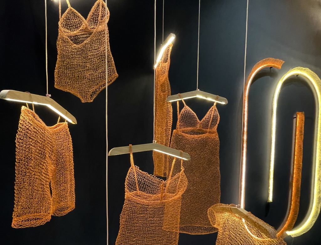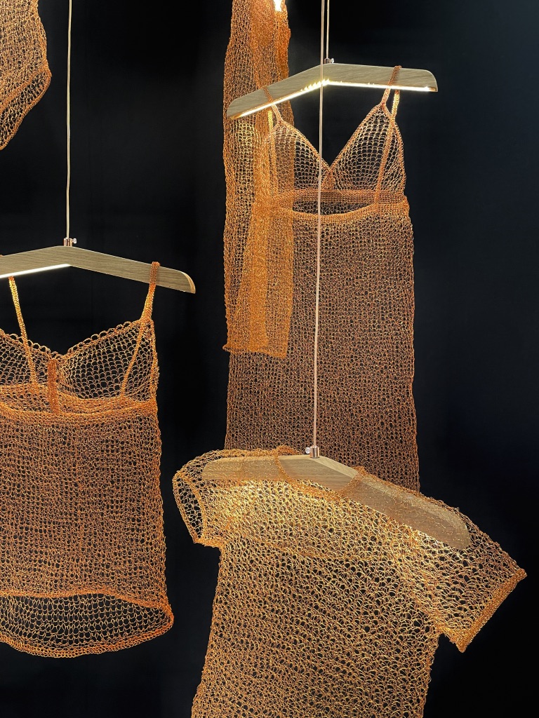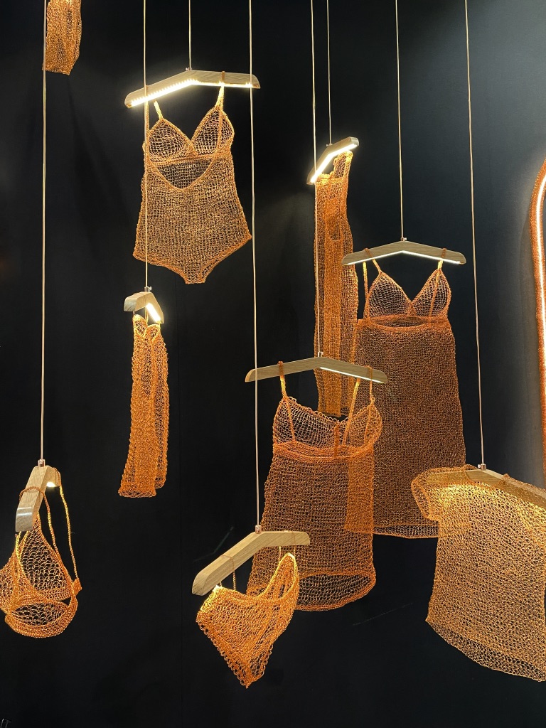 Devant la scénographie imaginée par La langue au chat, j’avais plutôt l’impression d’être devant une installation artistique que devant le showroom d’une marque… Je dois bien avouer avoir perdu mes repères tant la dimension muséale m’a interloquée. Sculpture? Textile? Tissage? Lumière? Je restai bouche bée.