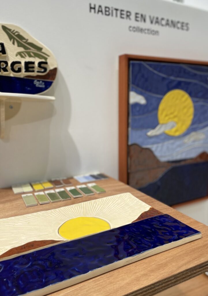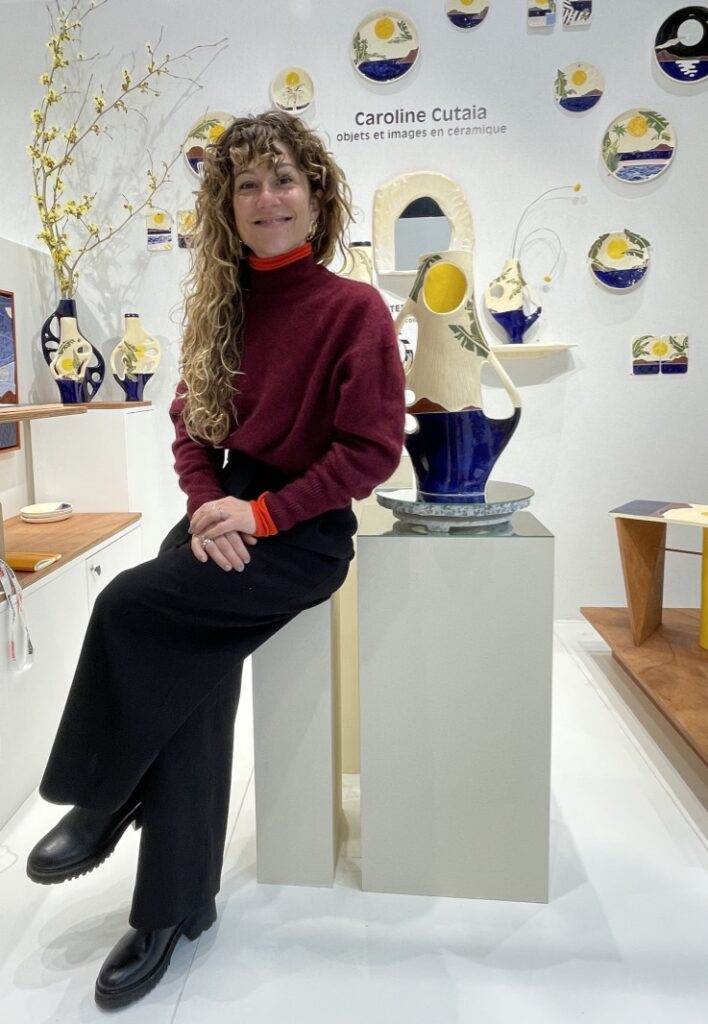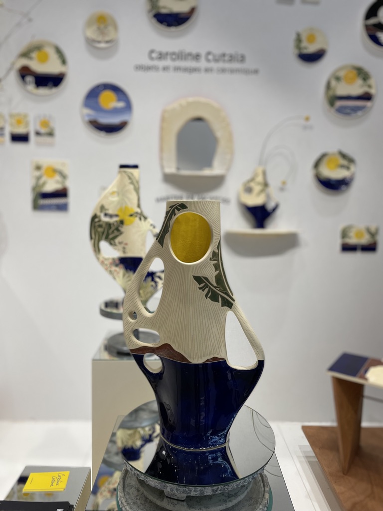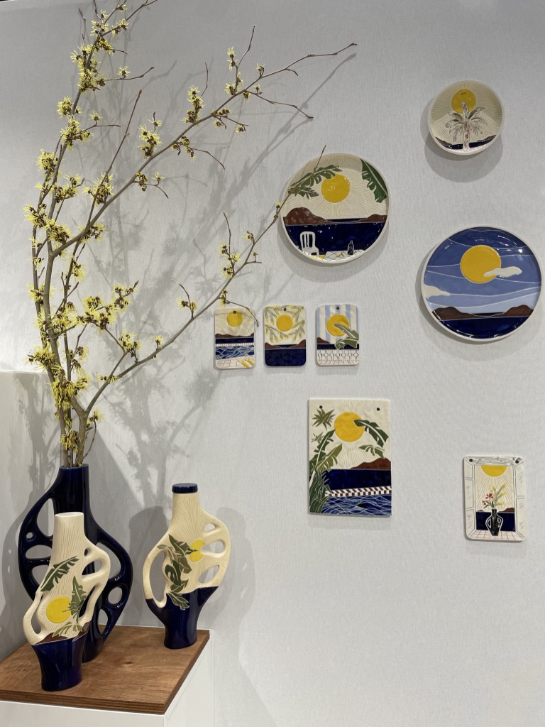 En parlant de sud, voici un charmant rayon de soleil dans le monde de la céramique. Il s’agit de Caroline Cutaia aussi charmante que talentueuse. Sa collection « Habiter en vacances » révèle plus qu’une série d’objets, une véritable démarche artistique. Sa réflexion autour de la course du soleil révèle des créations qui répondent certes à une problématique mais réveillent en nous une pointe de nostalgie dont il ne faut point avoir honte. Si les formes des vases nous rappellent ceux de nos grand-mères chéries, les cartes postales que l’on prenaient un malin plaisir à écrire dans notre enfance se font éternelles comme gravées à tous jamais dans nos intérieurs mais surtout dans nos mémoires. Toute le démarche de Caroline se concentre sur les ombres portées au fil d’une journée. Ses vases à fleur unique bouleversent inconsciemment nos schèmes sur le temps qui passe et qui s’égrène d’Est en Ouest.