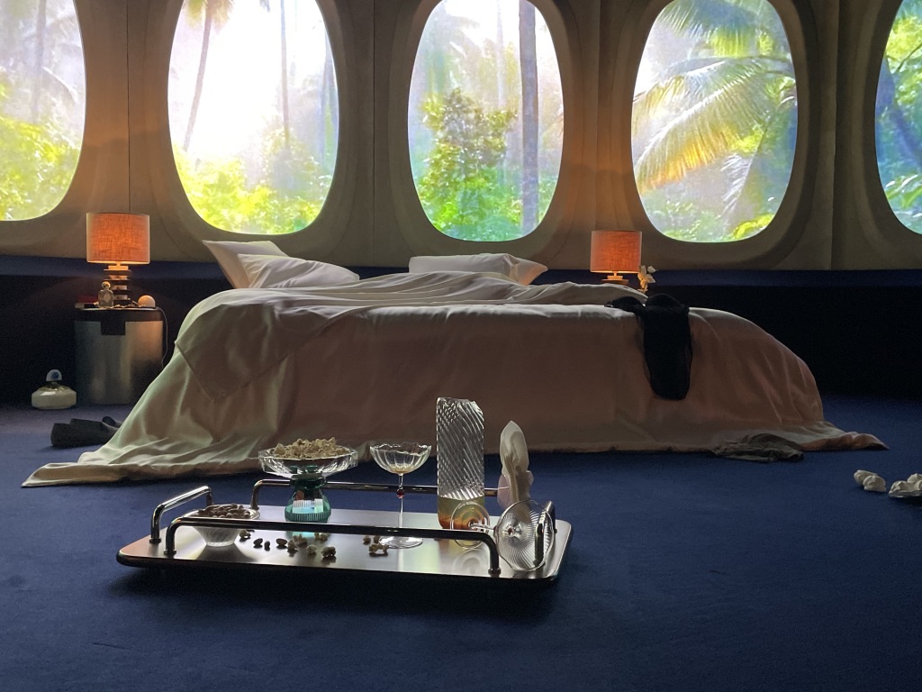 Partant du postulat qu’aujourd’hui tout se ressemble dans un monde où tout semble avoir été déjà dessiné, où la poursuite du confort est devenue l’unique préoccupation et cela quelque soit l’impact sur la planète, sur la beauté des paysages et des villes, le designer Rudy Guénaire nous fait embarquer dans La Suite 2046, un espace hors du temps, comme suspendu dans le Salon Maison&Objet, avec des hublots qui regardent vers un paysage de la décoration foisonnant, le tout bercé par la musique lancinante et mélancolique du thème du film Yumeji « In Mood for love« , de Shigeru Umebayashi. Face à ce tableau, le spectateur, ausculte minutieusement la chambre et ses objets en désordre tel un membre de la police scientifique, comme envouté par la mélopée de cette valse lente à trois temps.