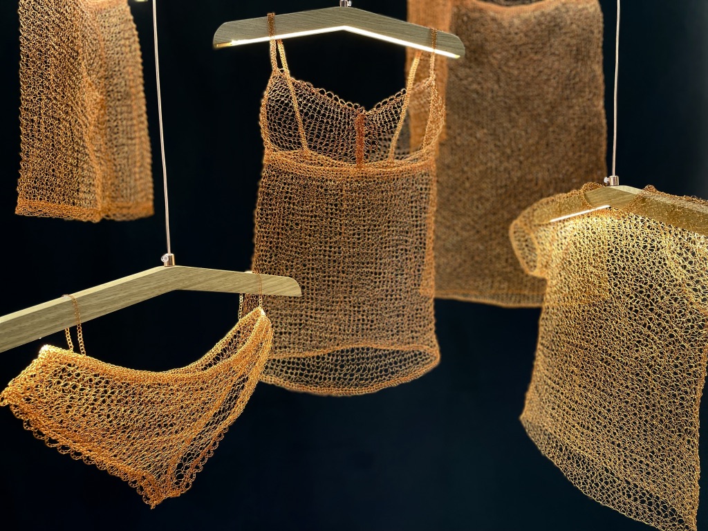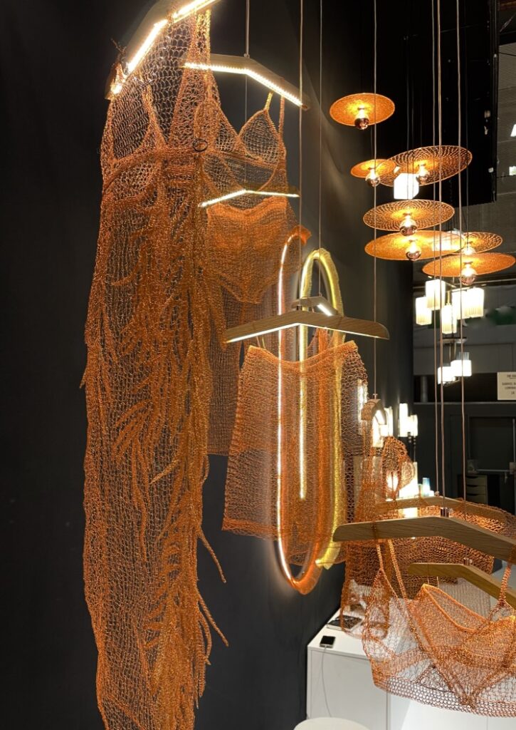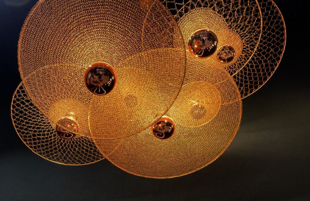 Les luminaires imaginés par Véronique Carlotti et Isabelle Royer sont de véritables sculptures lumineuses hors du commun, réalisées en fil de cuivre et travaillées au crochet ou au tricot. Les pièces sont uniques ou en petites séries ce qui les rend encore plus précieuses. Présentées en chapelet, elles évoquent la délicatesse, la fragilité, la poésie et la sincérité. Avec La Lanque au Chat, la frontière entre l’art et l’artisanat est floue, voire inexistante et l’approche artistique de ses créatrices, il faut bien l’avouer m’a touchée en plein cœur