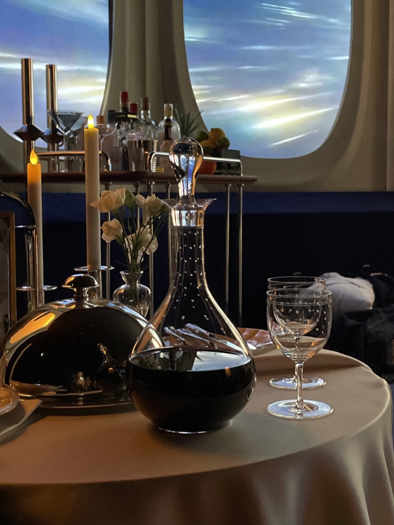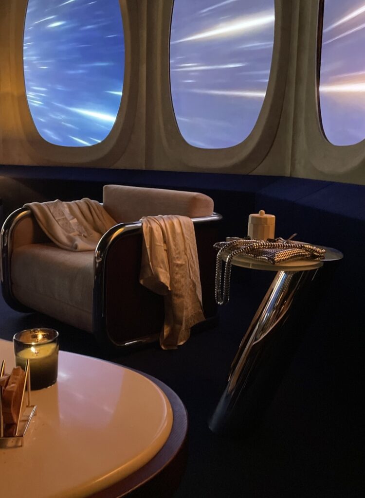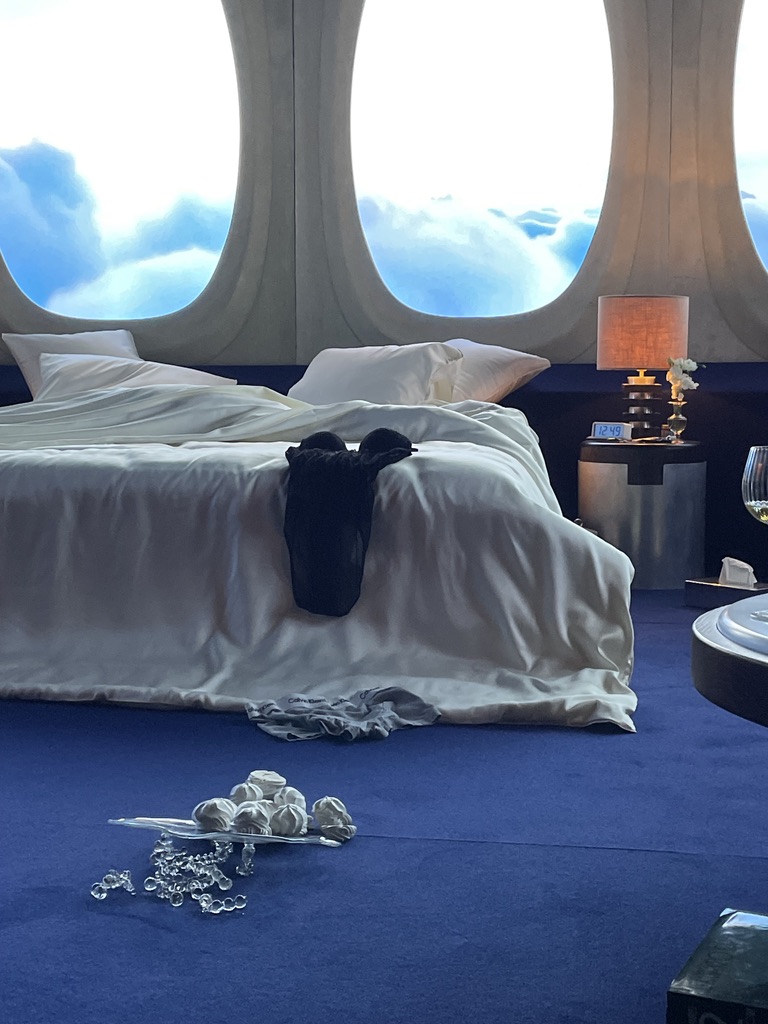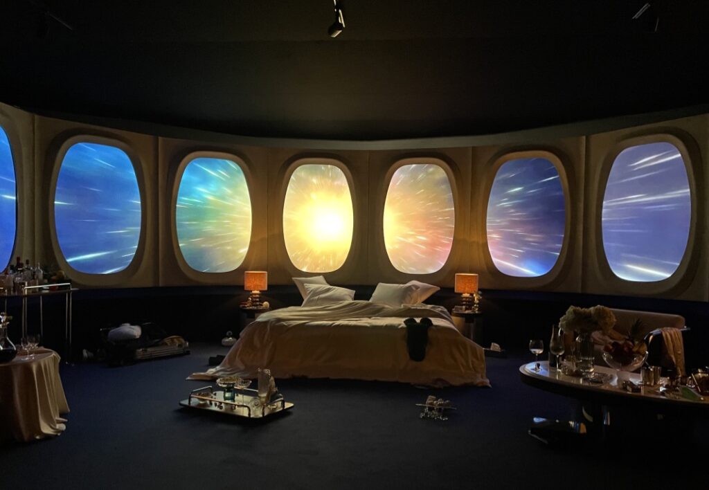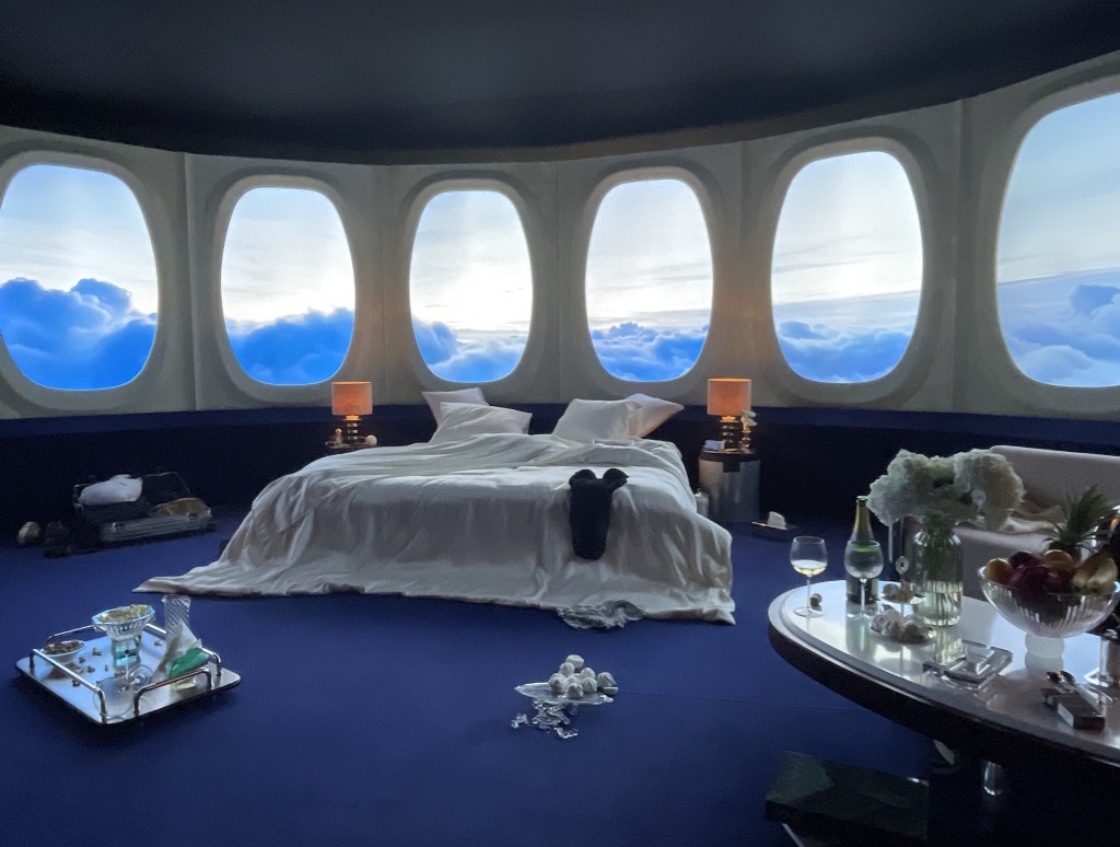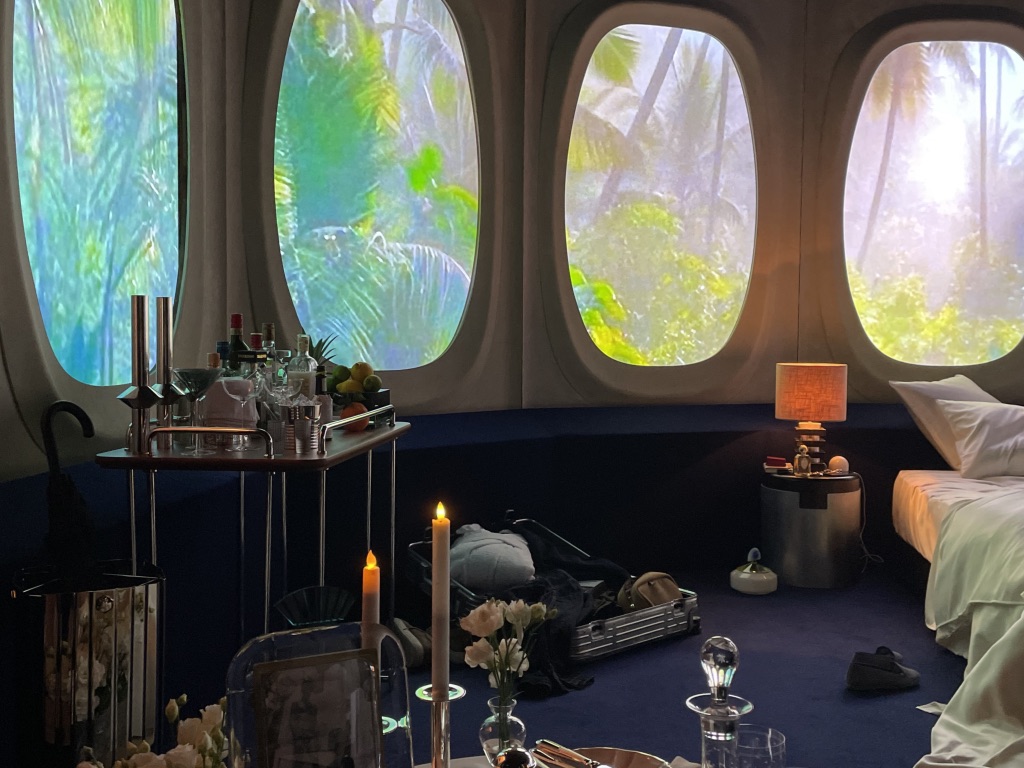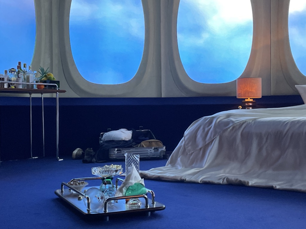 Rudy Guénaire met en avant dans sa scénographie très inspirée du monde du cinéma, la dimension nomade du voyage, incitant à regarder vers l’horizon, le plus grand luxe possible pour lui. La Suite 2046, c’est une fenêtre sur l’imaginaire à travers de nombreux hublots, une chambre d’hôtel rêvée au-dessus des nuages à l’intérieur de laquelle, quelque soit l’époque finalement, des êtres humains se prélasseront, prendront leur petit déjeuner ou leur douche et feront l’amour…
