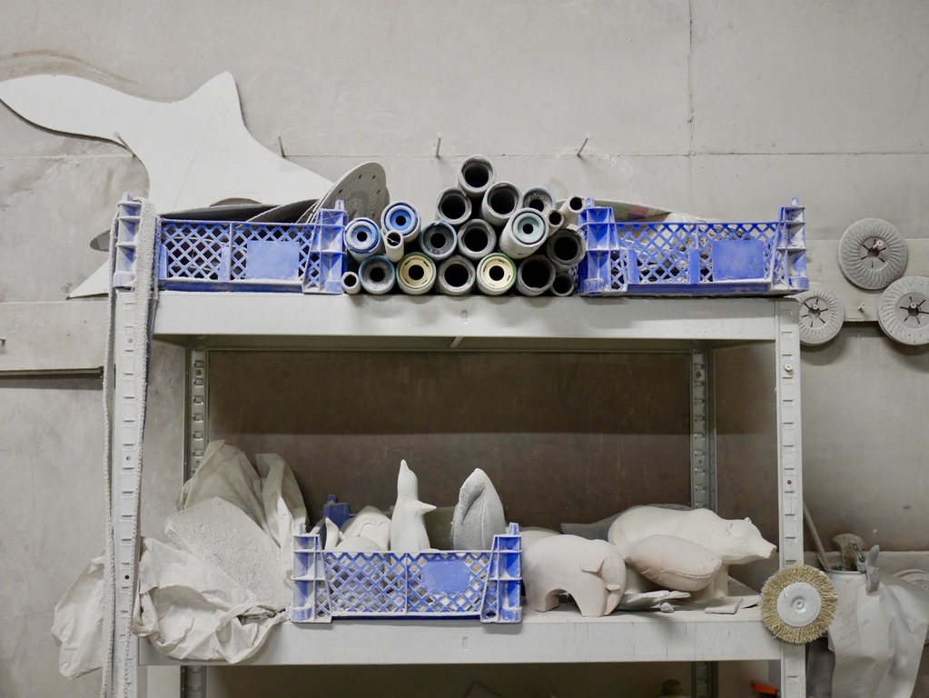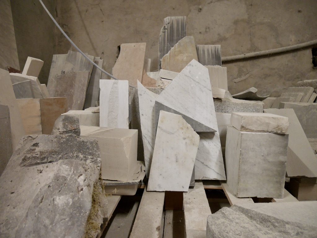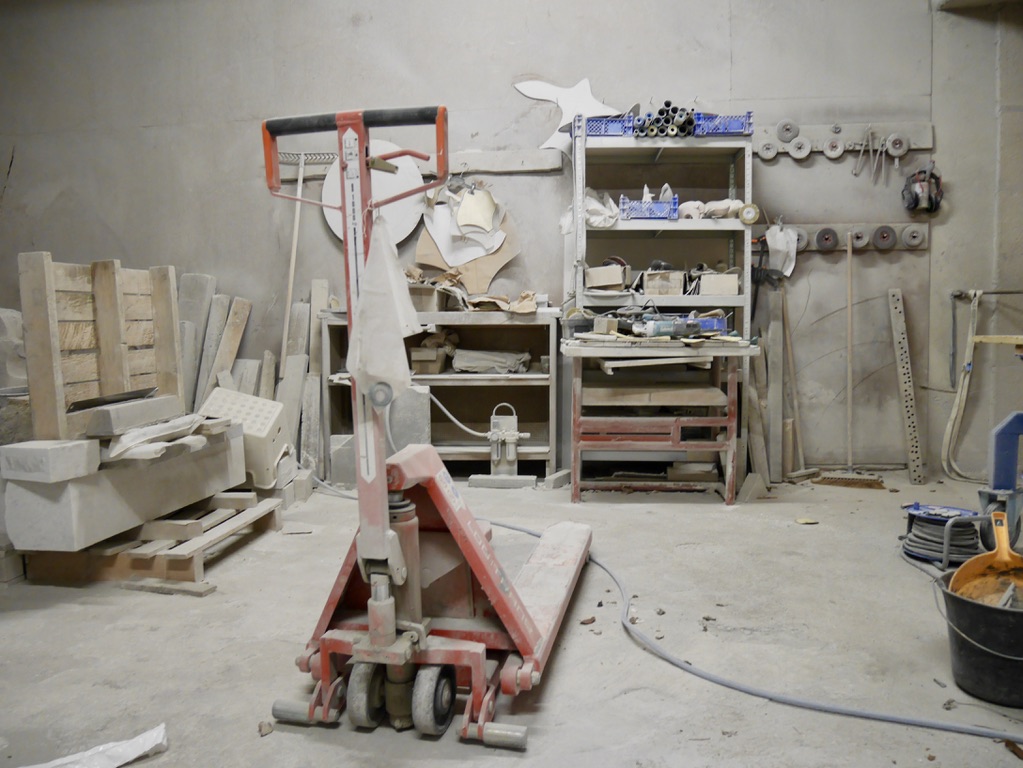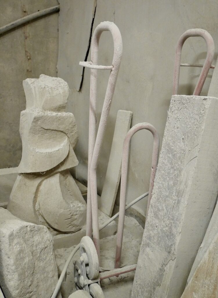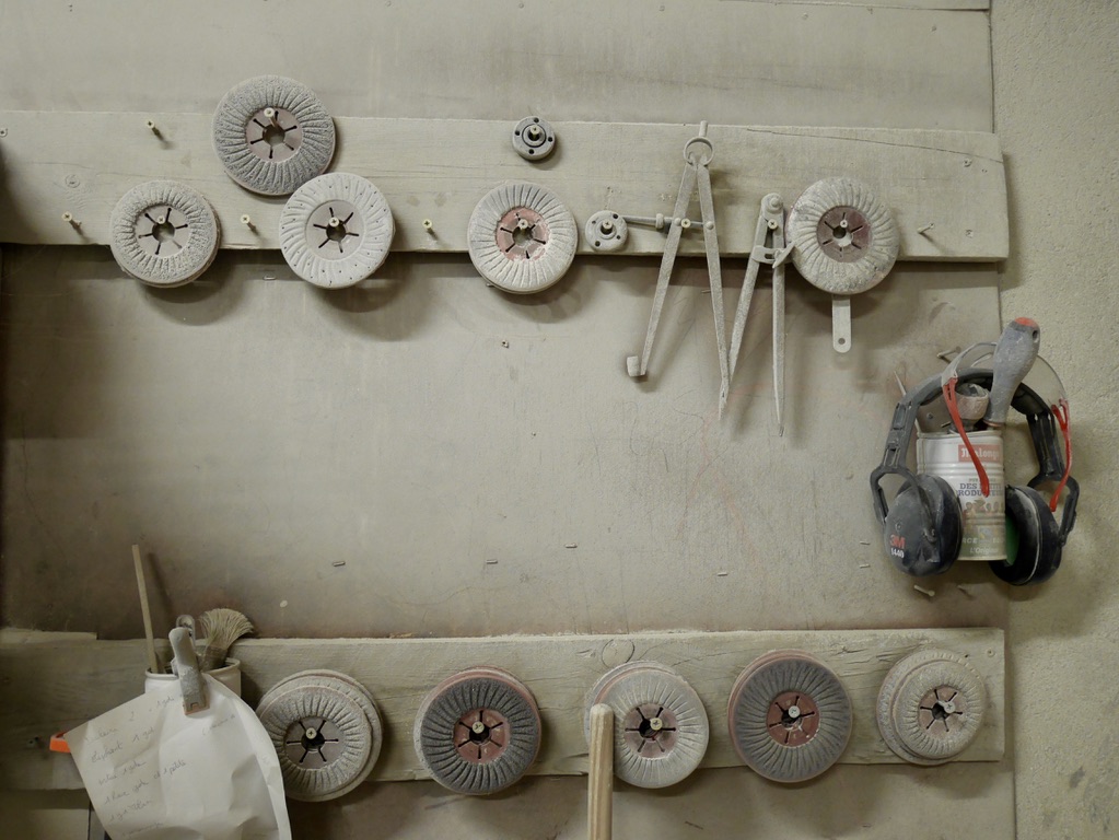 Là, c’est un autre monde qui s’ouvre à moi fait de machines et d’outils, de morceaux imposants de pierres, de poulies et de patrons. Cet envers du décor est à la fois surprenant et passionnant, entièrement recouvert d’une fine poussière blanche qui donne une impression étrange de sacré. C’est un vrai privilège de visiter l’antre secret de l’artiste, comme si Lucie me permettait de comprendre le process de sa création. Lucie est une magicienne, capable de transformer une matière brute en des objets d’un exquis raffinement et d’une douceur extrême, à l’image de sa personnalité.