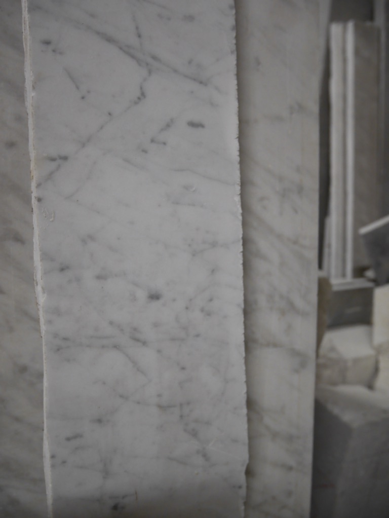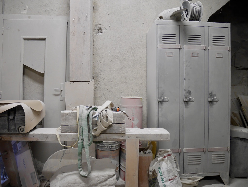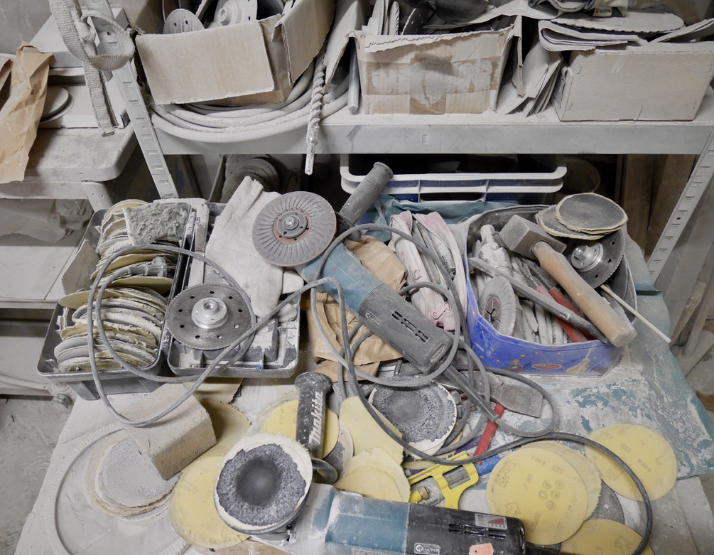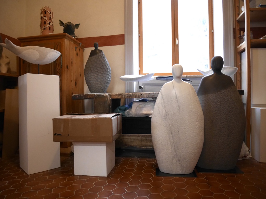 Là, c’est un autre monde qui s’ouvre à moi fait de machines et d’outils, de morceaux imposants de pierres, de poulies et de patrons. Cet envers du décor est à la fois surprenant et passionnant, entièrement recouvert d’une fine poussière blanche qui donne une impression étrange de sacré. C’est un vrai privilège de visiter l’antre secret de l’artiste, comme si Lucie me permettait de comprendre le process de sa création. Lucie est une magicienne, capable de transformer une matière brute en des objets d’un exquis raffinement et d’une douceur extrême, à l’image de sa personnalité.