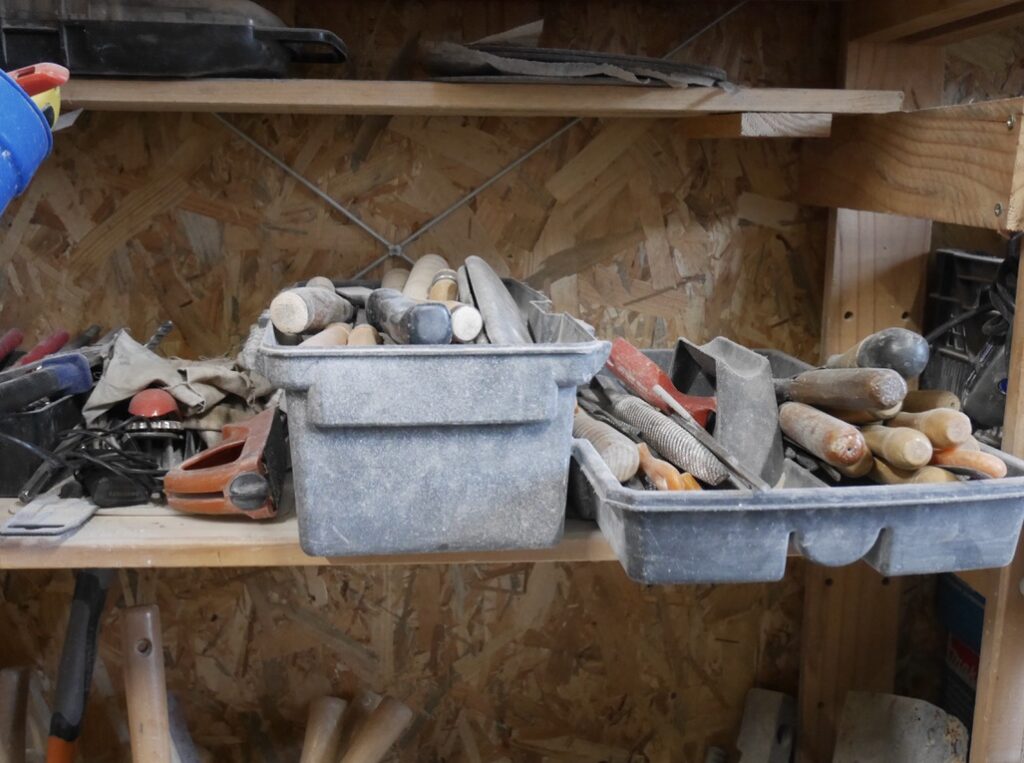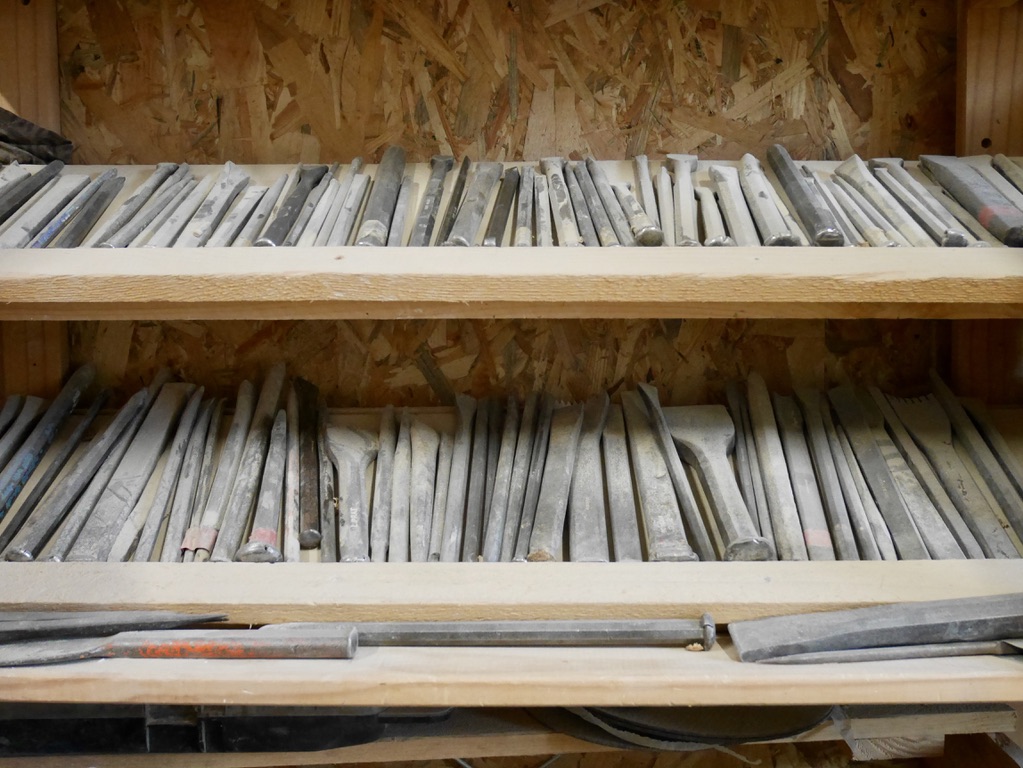 Dans l’arsenal de votre atelier du Monastier-sur-Gazeille, avec quel outil avez-vous le plus d’affinité ? Les traditionnels ciseau et maillet offrant un contact direct avec la matière ? Des outils comme le burin pneumatique ou autres meuleuses et polisseuses électriques facilitant les opérations de finition ? Je travaille autant avec des outils électriques que manuels, mais j’apprécie particulièrement le travail à la main. La massette portugaise et les ciseaux me permettent de façonner lentement la pierre, révélant peu à peu la forme de ma sculpture. J’utilise aussi des outils électriques comme les meuleuses pour dégrossir la pierre,cette étape est essentielle et me permets d’approcher ma forme plus rapidement pour laisser la place au travail à la main .