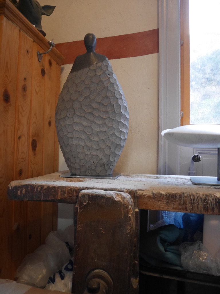 La pierre qui vous est si chère est un matériau noble par excellence, solide et durable. Qu’elle soit calcaire, volcanique ou quartzite, chaque pierre porte en elle l’histoire de la Terre, offrant des textures uniques et des nuances authentiques. Quelle est la pierre que vous préférez façonner et sublimer et pourquoi ? J’aime la pierre dure sur laquelle on peut travailler la matière et différentes textures.Au début de mon activité je travaillais plutôt les pierres locales granite, arkose, pierre volcanique sur lesquelles j’avais été formée, puis l’envie de découvrir et de travailler d’autres pierres m’ont fait découvrir les marbres, les calcaires. Aujourd’hui j’aime sculpter sur différentes pierres selon le message que je souhaite faire passer dans ma sculpture. D’une pierre à l’autre le rendu et ce que l’on peut éprouver en regardant une pièce n’est pas du tout le même.