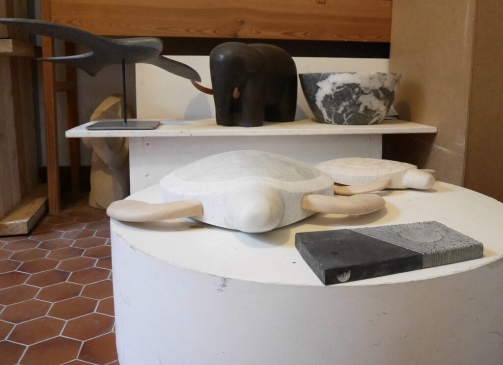 Le métier de tailleur de pierre a trouvé ses lettres de noblesse au Moyen-Age. Votre appétence pour le thème animalier dans vos créations me donne envie de me replonger dans les célèbres bestiaires médiévaux qui regroupaient des fables et des moralités sur les « bêtes ». Vos éléphants, oiseaux au long cou, baleines, vos aigles des mers ou encore vos petites tortues bien réels pourraient-elles se transformer un jour au gré de votre esprit inventif en créatures imaginaires alimentant les mythes et les légendes des hauts plateaux sauvages du Mezenc ? Ma sculpture animalière a été largement influencée par la naïveté de l’art médieval et de ces représentations simples dans leur forme. Mais pourquoi pas rejoindre un jour un univers fantastique, pour le moment j’aime me confronter à des choses existantes et leur rendre un hommage en les représentant et en essayant de les sublimer afin de les mettre en valeur toujours dans un quête de valorisation de la nature ,celle-ci est tellement riche.
